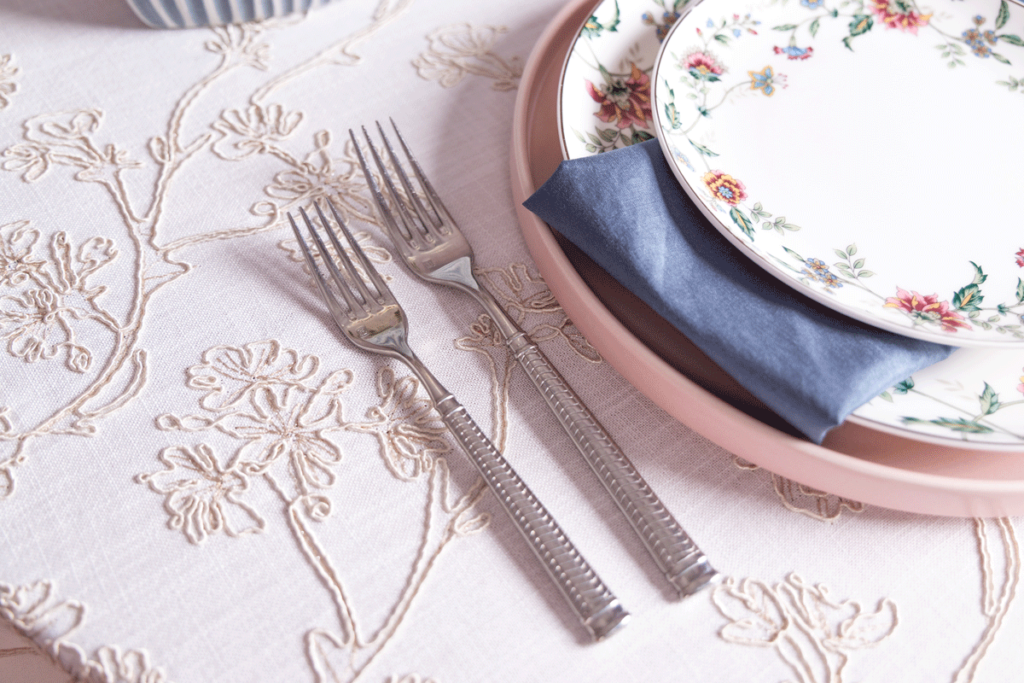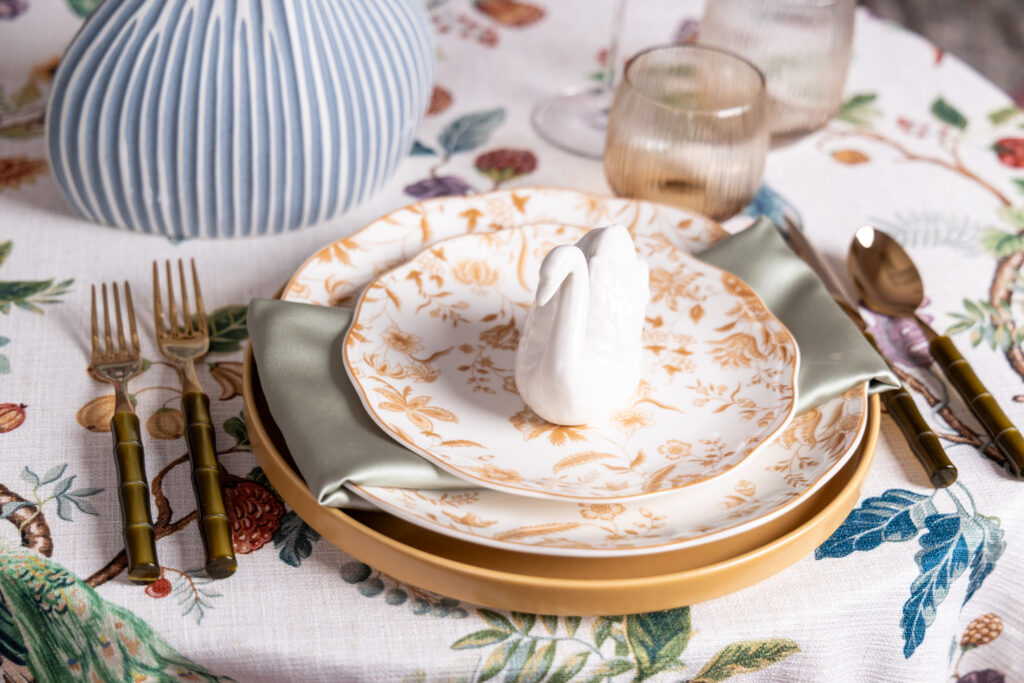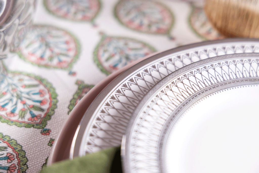 The Power of Pattern Play: Don’t be afraid to mix geometric patterns with organic ones. Our Platinum Westminster plates are the perfect unique complement to our brand new Spring Green Avani Linen. When paired with the new Caleb Charger, you are able to break up the patterns and allow for each piece to stand out while still creating unity.