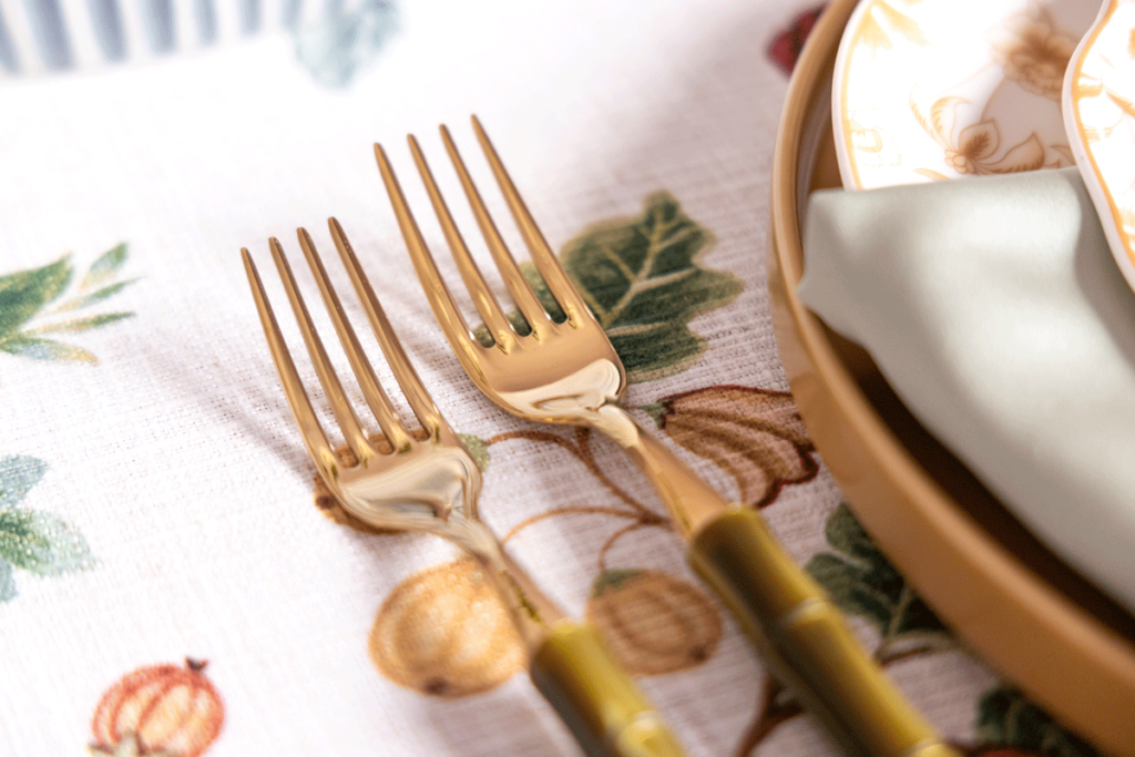 Green is the New Neutral: Our pearlized Olive Bamboo Flatware has quickly become a designer favorite. It adds an architectural, organic element to the table that balances out softer, more traditional china. What makes this flatware design so great is its versatility. The olive-green acts as a neutral and can be paired with virtually any color palette; don’t be afraid to experiment. Try it out with our Citron Prentice or Coffee Satin linens!