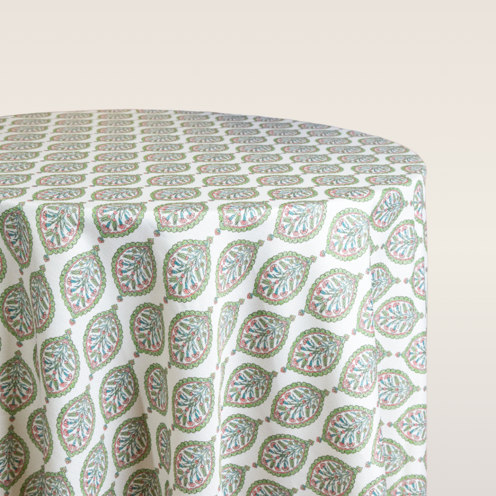 Inspired by traditional Indian Buti block prints, the Spring Green Avani linen balances botanical charm with rhythmic energy. Its repeating teardrop medallions, framed in lush green and coral-pink sprigs, create a soulful “stamped” aesthetic. This design offers a refreshingly modern way to ground your composition in old-world artistry.