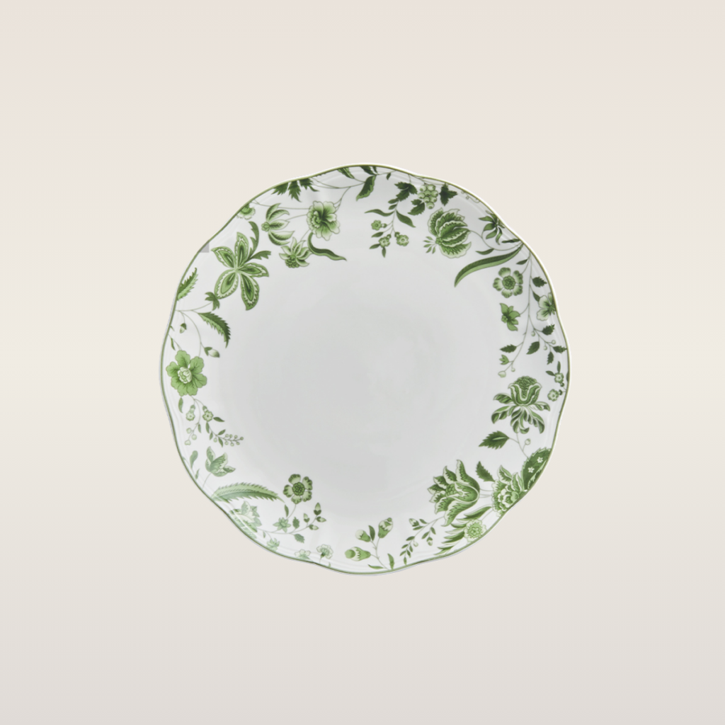 The Vivian fern plate features a classic, botanical-inspired design with delicate green floral patterns scattered across a white background. The scalloped edge and thin green rim add a touch of traditional elegance, reminiscent of antique porcelain. The 10” has the design only on the rim, while the 8” has the motif covering the entire plate.