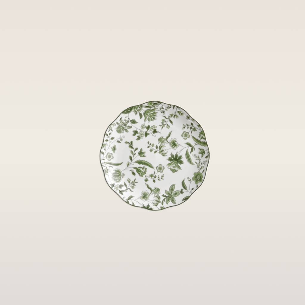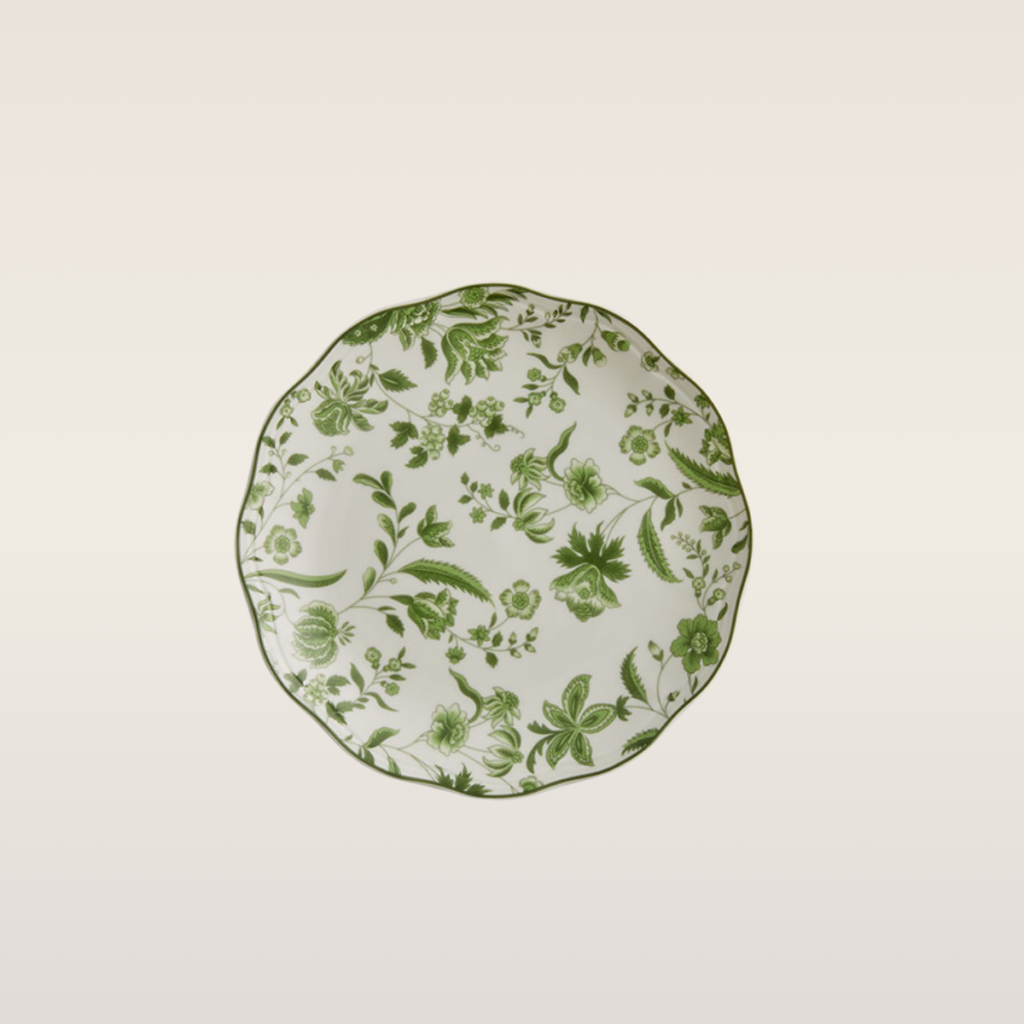 The Vivian fern plate features a classic, botanical-inspired design with delicate green floral patterns scattered across a white background. The scalloped edge and thin green rim add a touch of traditional elegance, reminiscent of antique porcelain. The 10” has the design only on the rim, while the 8” has the motif covering the entire plate.